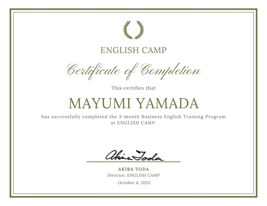 You should have basic conversational English (high school–level English or above). ENGLISH CAMP is designed for non-native professionals who want to use English in real business situations.